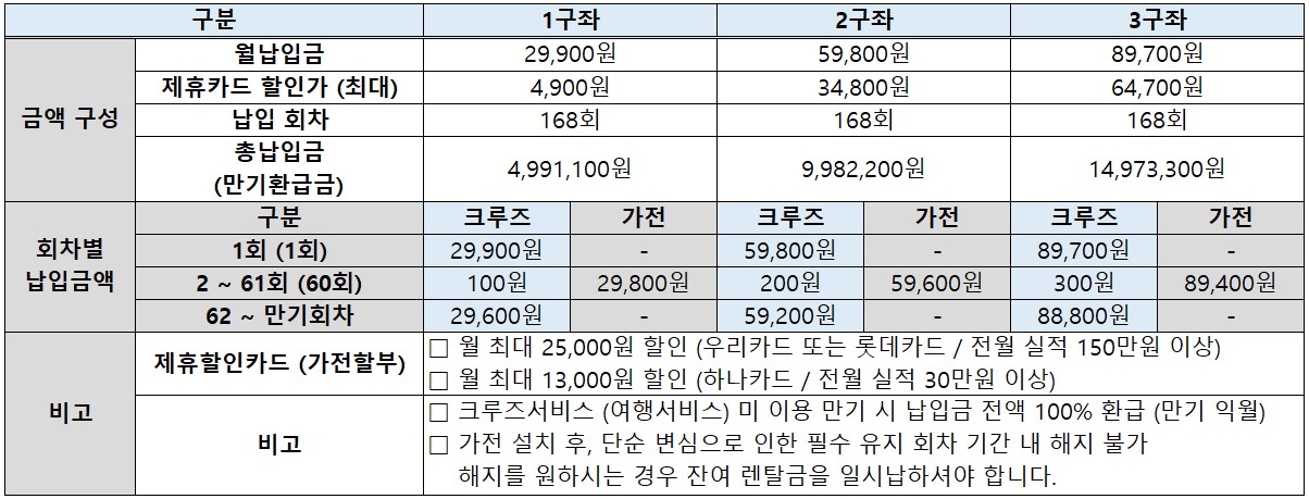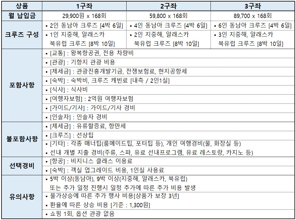 해당 상품은 가전제품과 크루즈여행이 결합된 상품입니다. 가입에 관한 자세한 상담은 현대투어플랜 대표번호 [1688-2682]로 부탁드립니다.